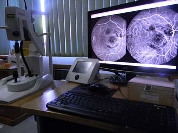 Utilizado o equipamento HRA-2 da Heidelberg Engeneering que além de fotos é capaz de fazer cineangiografia. A angiografia fluorosceínica e por indocianina verde podem ser realizadas de forma simultânea neste equipamento.